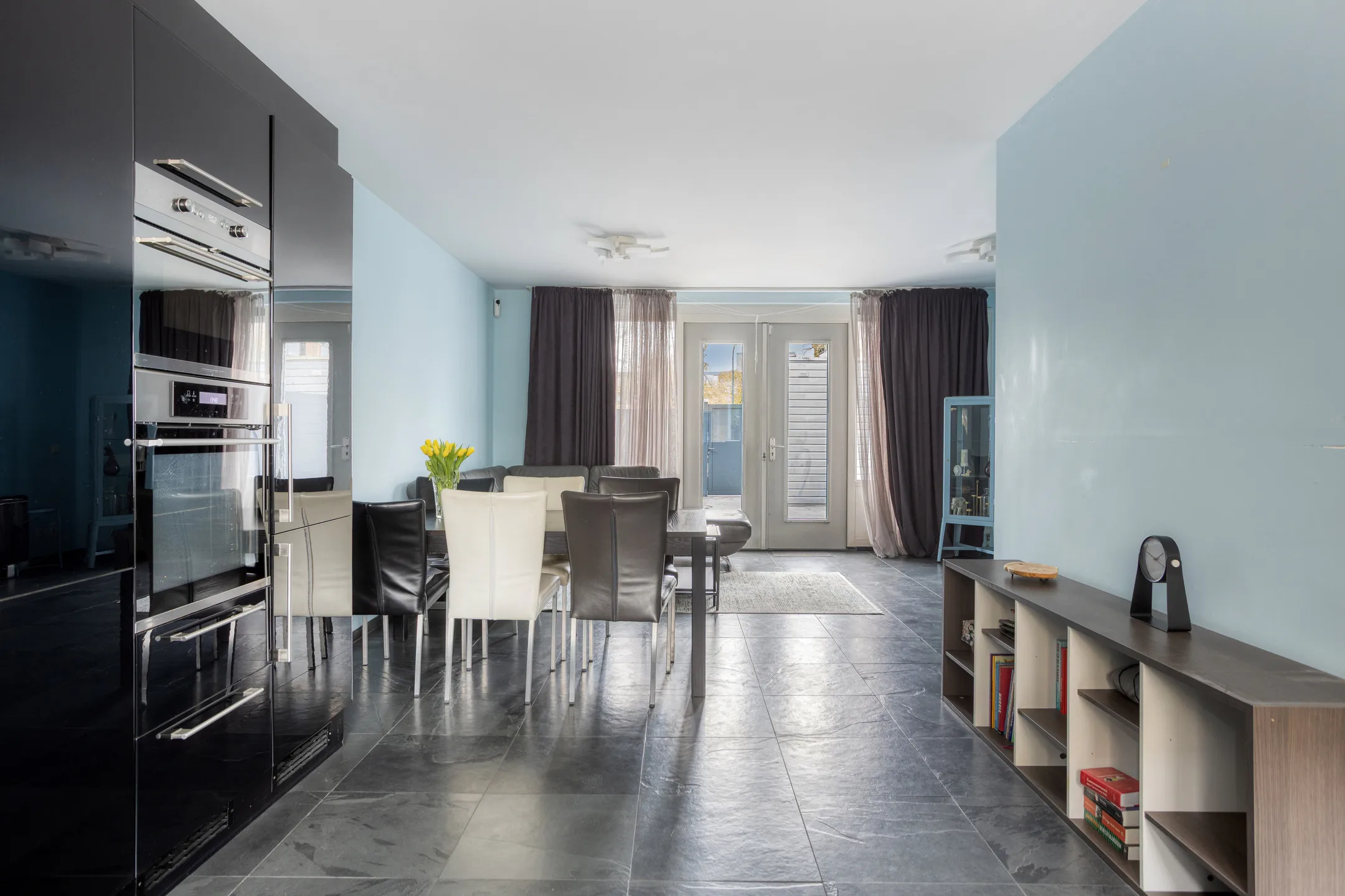Je komt binnen in de ruime hal met toegang tot het separate toilet en de moderne keuken aan de voorzijde. De keuken is in 2020 vernieuwd met nieuwe keukenkastjes en een nieuw granieten keukenblad, en is voorzien van alle benodigde inbouwapparatuur. De tuingerichte woonkamer is licht en ruim dankzij de grote raampartijen en de openslaande deuren naar de achtertuin. De gehele begane grond is voorzien van een natuurstenen vloer, wat zorgt voor een stijlvolle en duurzame uitstraling.